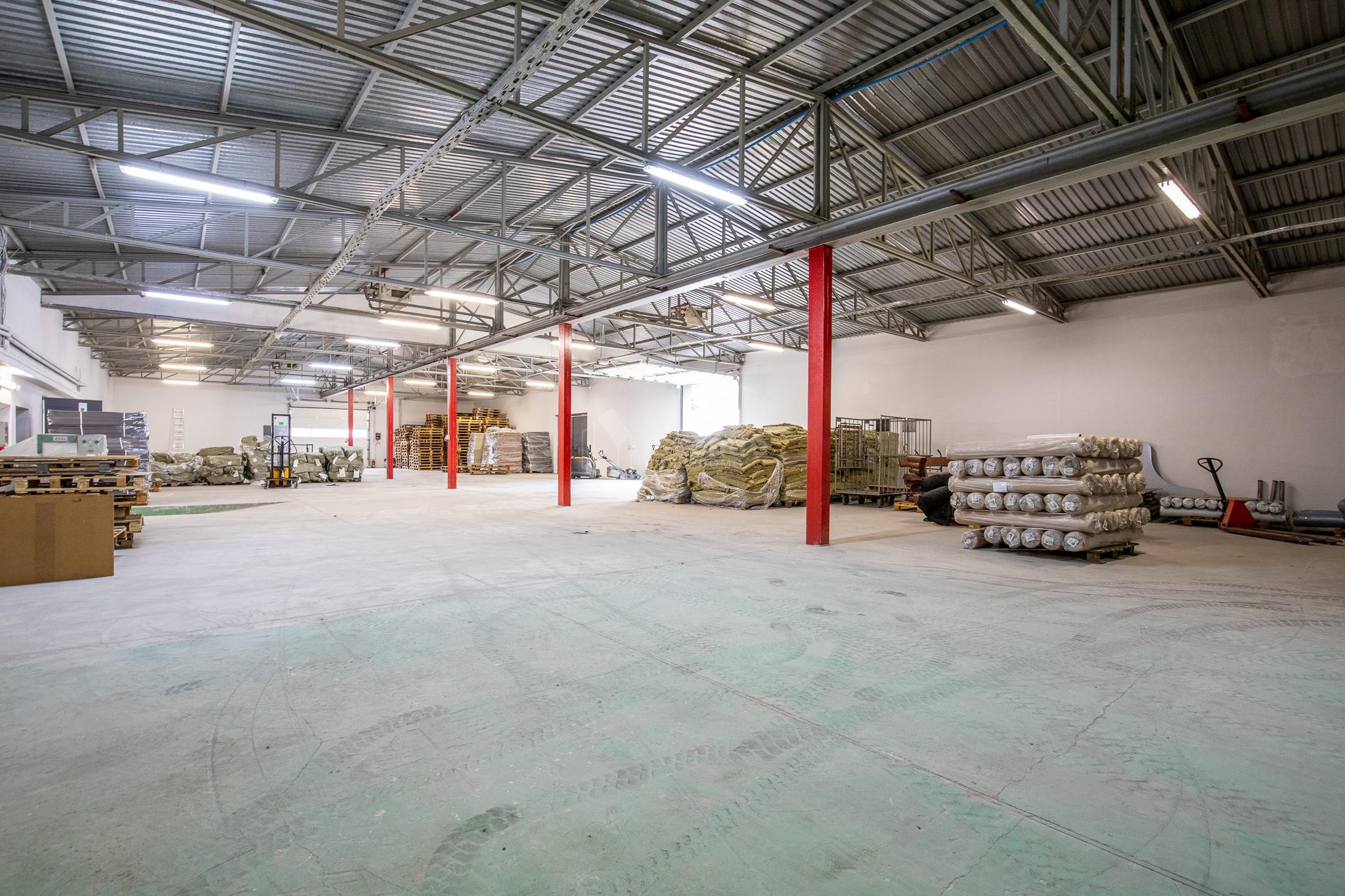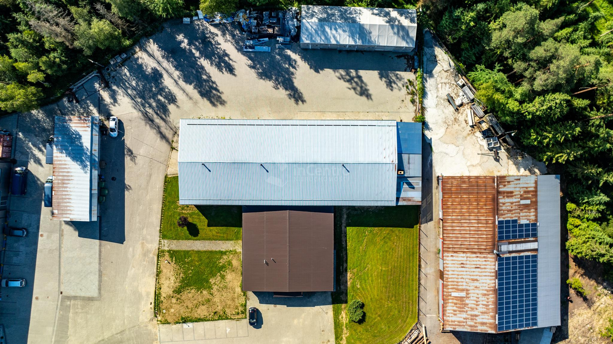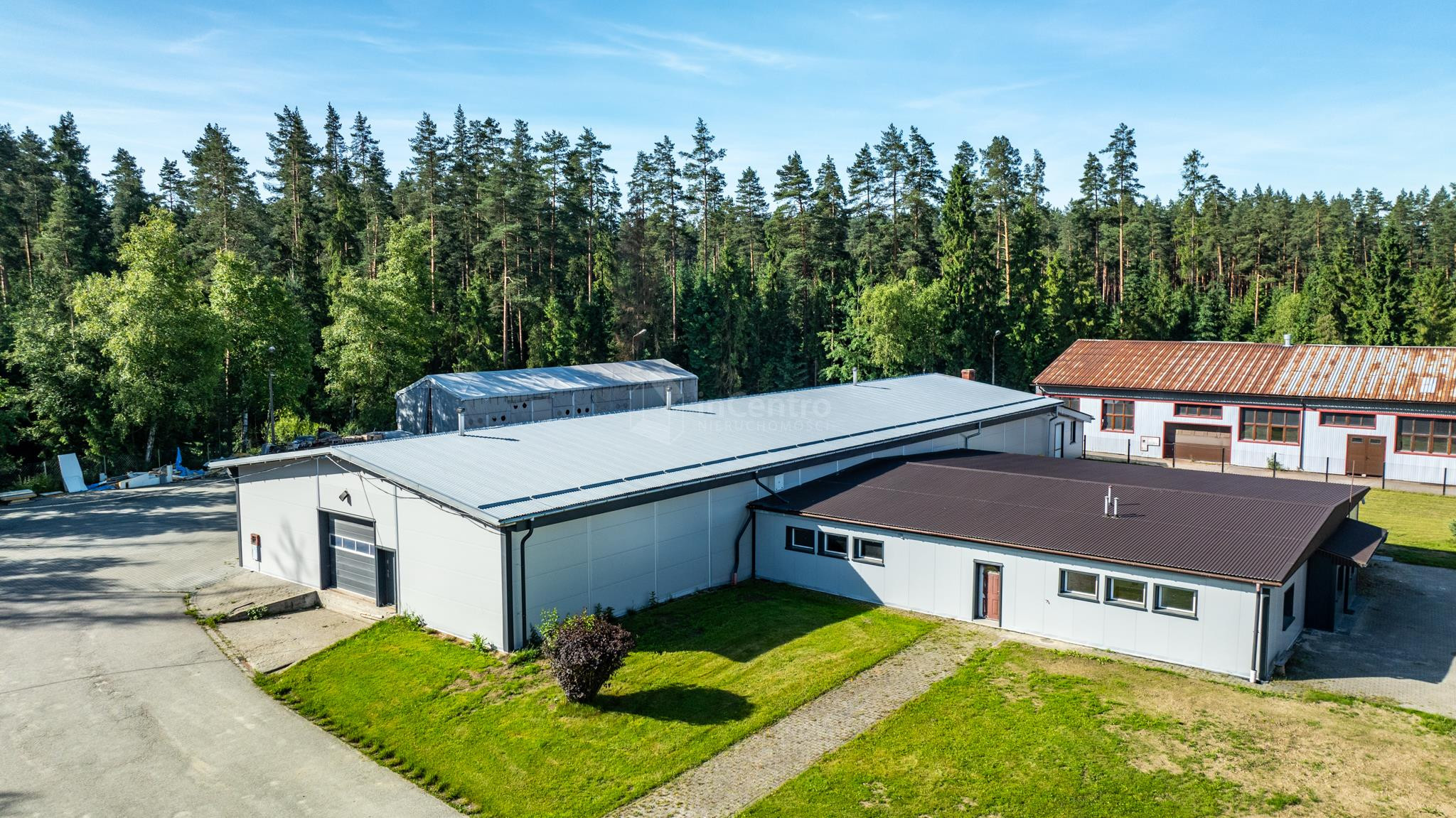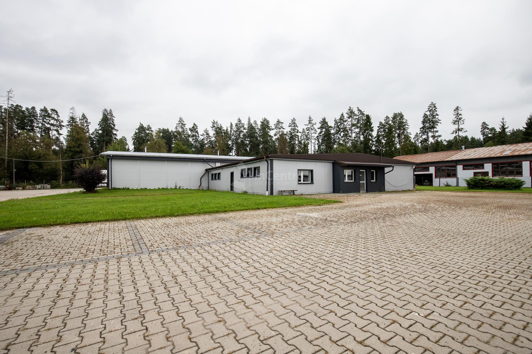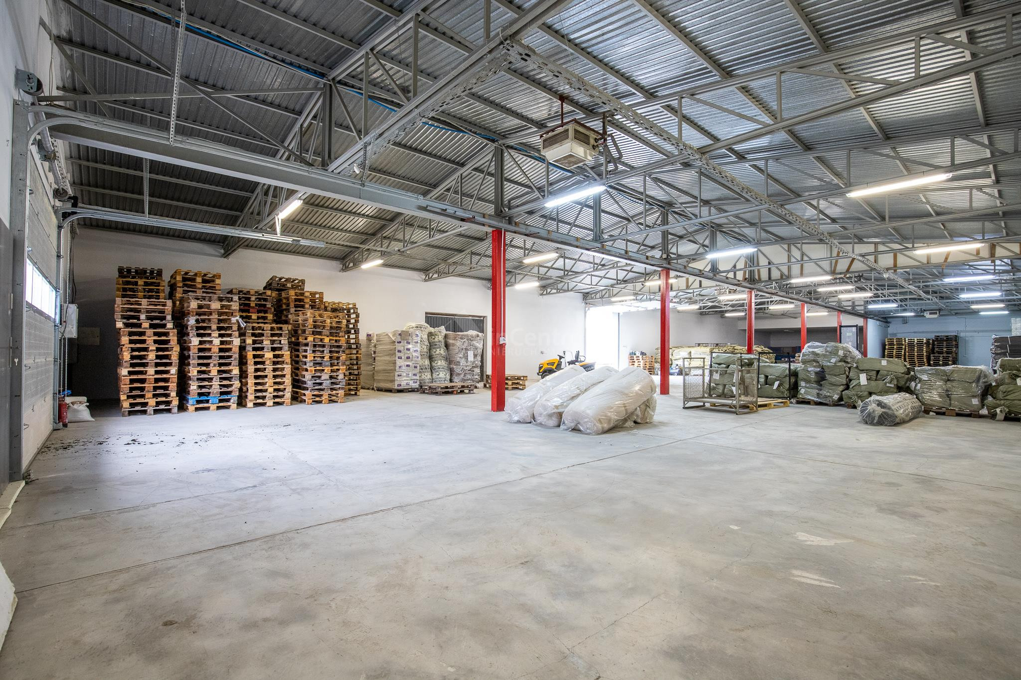 Budynek w skład którego wchodzą dwie bryły o formie prostokąta, oraz kwadratu tworzące kształt litery T, budynek niepodpiwniczony, parterowy w zwartej zabudowie. W skład wnętrza wchodzi część biurowo-administracyjna o powierzchni ok. 300m2. wybudowana w technologii tradycyjnej murowanej, oraz część magazynowa o powierzchni ok. 700m2. oparta o konstrukcję stalową wypełnioną murowanymi ścianami (pustak o grubości 24cm.). Posadzki w części biurowo - administracyjnej wykończone płytkami ceramicznymi, oraz panelami podłogowymi. W części magazynowej beton zatarty na gładko. Budynki wyposażone w instalację elektryczną, wodociągową, kanalizacyjną, teletechniczną, oraz alarmową. Ogrzewanie wraz z przygotowaniem ciepłej wody za pośrednictwem własnej kotłowni z piecem na paliwo stałe z podajnikiem mechanicznym. Wysokość hali magazynowej między 360cm. a 390cm. Przy budynku plac manewrowy, oraz miejsca postojowe.