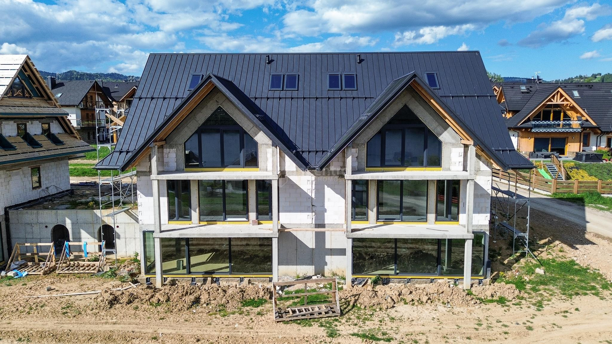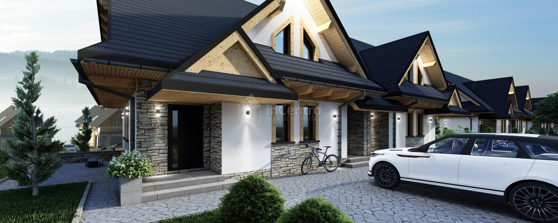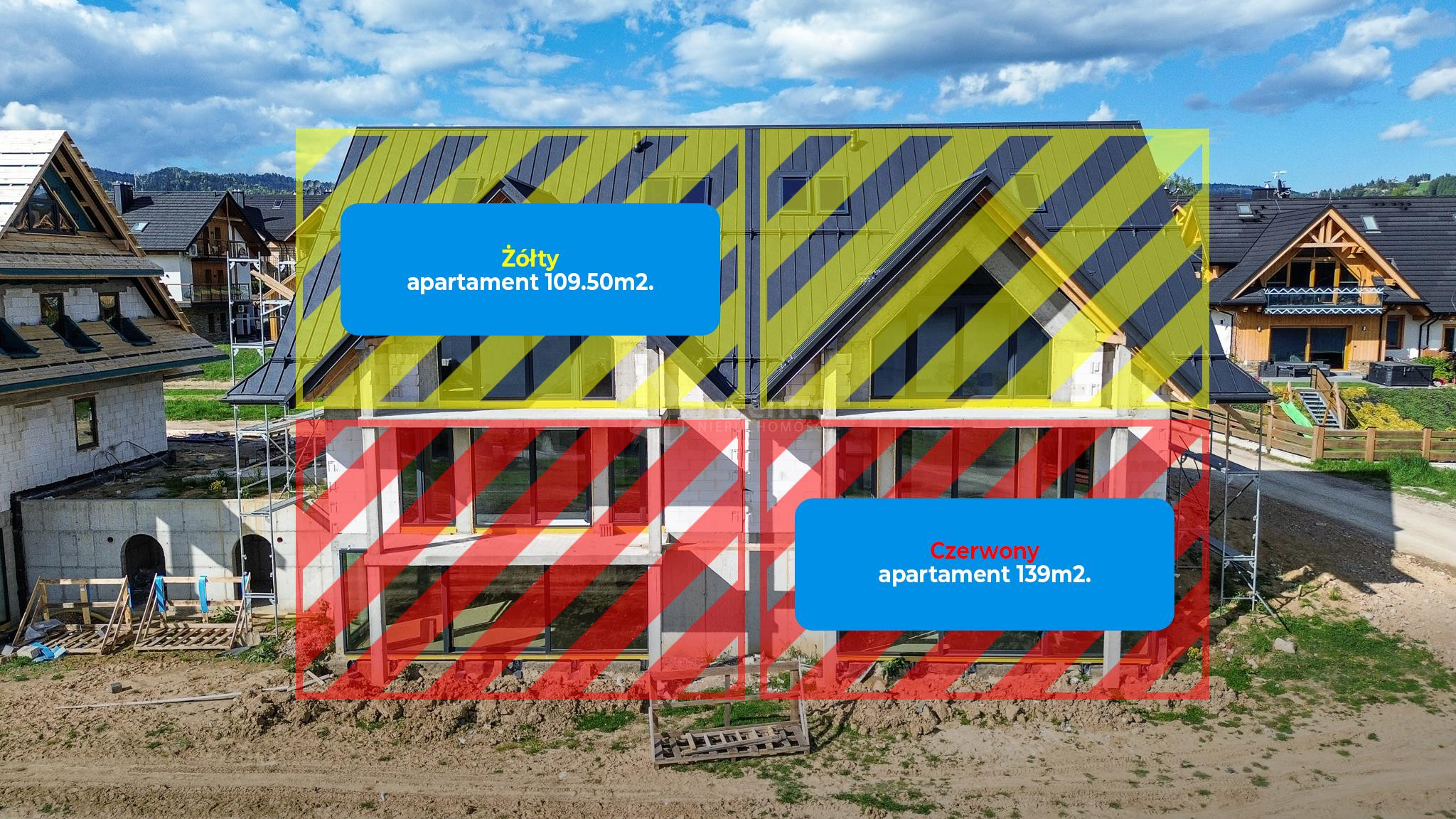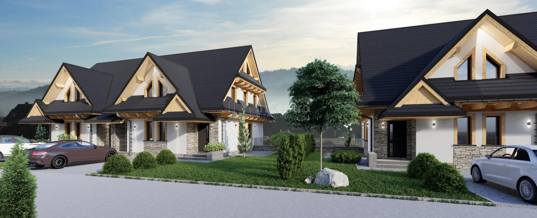 Standard Budynku i Technologia: Cały budynek składa się z czterech apartamentów (dwa o powierzchni 109,50 m² i dwa o powierzchni 139 m²), zaprojektowanych z dbałością o jakość i energooszczędność. Konstrukcja: Budynek wzniesiony z solidnego pustaka H+H 24 cm. Ocieplenie: Ściany zewnętrzne docieplone styropianem o grubości 15 cm, natomiast poddasze ocieplone zostało wełną mineralną, co gwarantuje doskonałe parametry izolacyjne i niskie koszty utrzymania. Stolarka okienna i balustrady: Nowoczesne okna trzyszybowe (połączenie profili aluminiowych i plastikowych) zapewniające optymalne wyciszenie i izolację termiczną. Na balkonach zamontowane eleganckie, szklane barierki, które doskonale komponują się z widokiem i dodają prestiżu. Elewacja: Budynek będzie wyróżniał się estetyczną elewacją, w części pokrytą naturalnym kamieniem, co podkreśli jego charakter i harmonijnie wpisze się w otoczenie. Dach: Pokrycie dachu wykonane z trwałej blachy "na rąbek". Ogrzewanie i wentylacja: Za komfort cieplny odpowiadać będzie nowoczesna pompa ciepła współpracująca z ogrzewaniem podłogowym wodnym, co zapewni efektywność i ekonomiczność. Dodatkowo w apartamencie zainstalowana zostanie rekuperacja, gwarantującą stałą wymianę powietrza, jego filtrację i odzysk ciepła. Media: Apartament podłączony jest do wodociągu gminnego, a odprowadzanie ścieków realizowane jest do szczelnego szamba (zbiorniki będą znajdować się przy pierwszym budynku wjeżdżając na inwestycje).